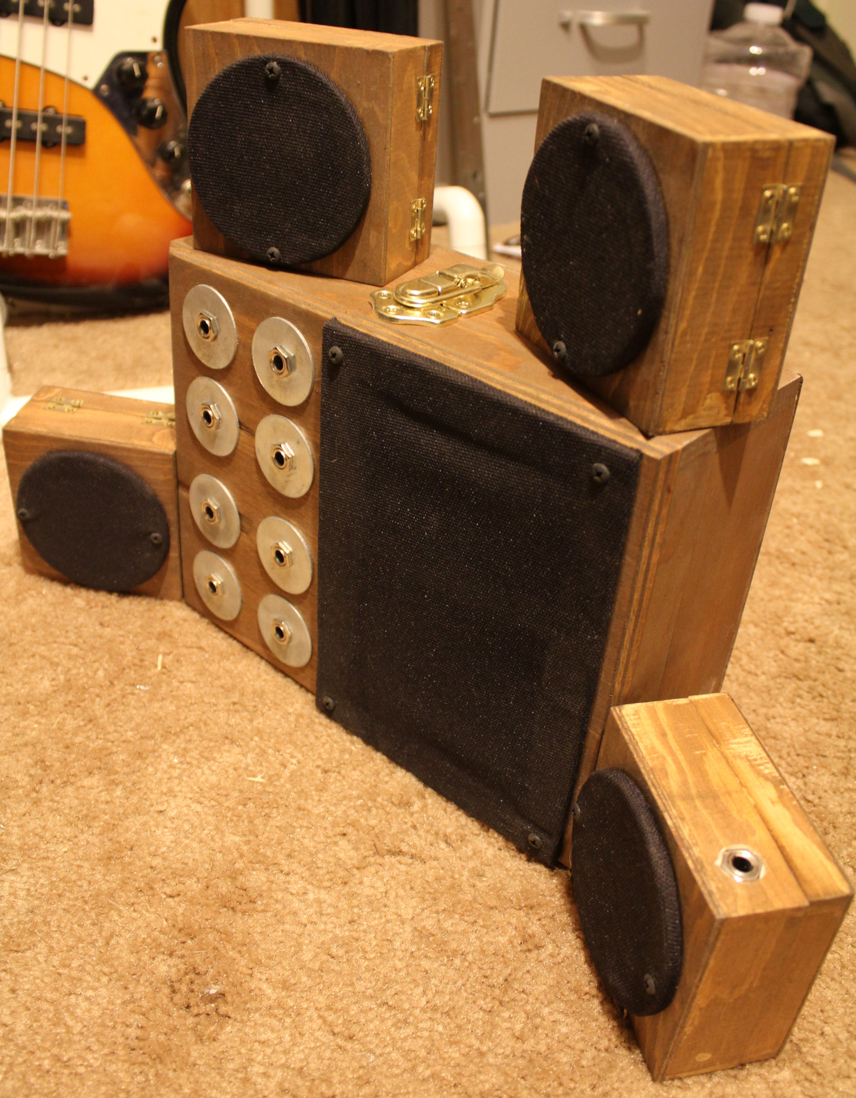 Speakers, Hardware, Dollar-Store Boxes, Recycled Electronics2012A miniature 4.1 speaker system created out of recycled electronics.
